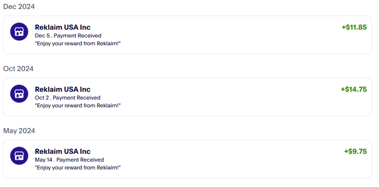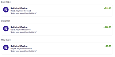 Reklaim pays me around $1 a week to share my device data and occasionally answer profile questions. Here are some paypal withdraws I used my earnings on.